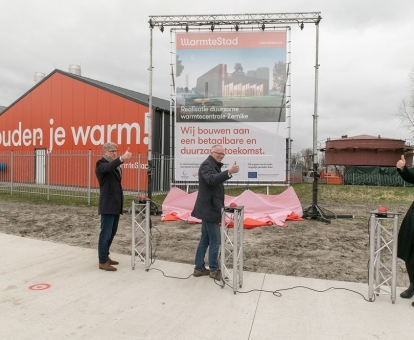 Woensdag 31 maart is officieel begonnen met de bouw van onze warmtecentrale. Wethouder Broeksma van de gemeente Groningen, directeur Riksta Zwart van Waterbedrijf Groningen en directeur Dick Takkebos onthulden hiervoor het gloednieuwe bouwbord.