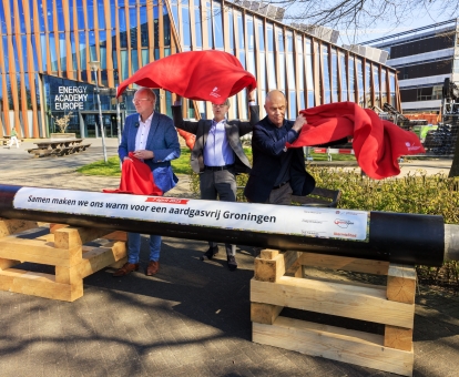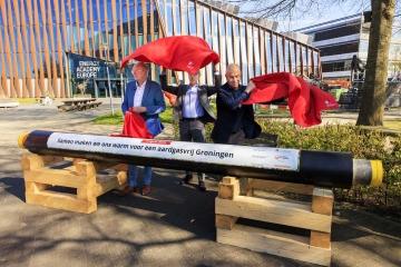 Maandag 7 april vierden Hans Biemans (Rijksuniversiteit Groningen), wethouder Energietransitie Philip Broeksma en Dick Takkebos (WarmteStad) samen met Hanze en RUG studenten, een belangrijke stap naar een aardgasvrije Zernike Campus. De komende twee jaar breiden we ons publieke warmtenet uit op de Campus, waardoor de universiteit haar gebouwen op de Campus kan aansluiten op duurzame warmte. Bestuurders onthulden voor deze gelegenheid de ‘warmte toekomstboodschap' voor de Zernike Campus. Deze boodschap is vastgelegd op een warmteleiding en wordt als een tijdscapsule onder de Campus ingegraven.