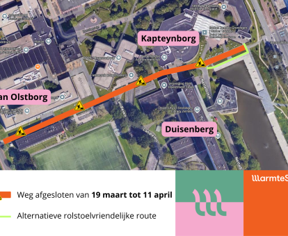 De looproutes tussen het Duisenberggebouw, de Kapteynborg en de Foodcourt zijn minder goed bereikbaar. Er is deze periode een alternatieve rolstoelvriendelijke looproute via de vlonder naast de Duisenbergvijver.